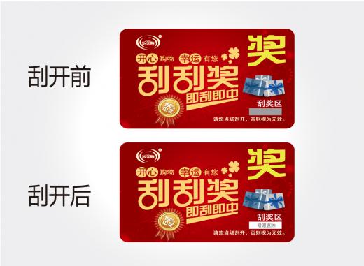 抽獎(jiǎng)式刮刮卡包括刮獎(jiǎng)卡、刮刮樂卡、促銷抽獎(jiǎng)卡、抽獎(jiǎng)積分卡此類刮刮卡應(yīng)用比較廣泛,由其對(duì)大型超市及各類產(chǎn)品生產(chǎn)商是非常不錯(cuò)的營(yíng)銷方式。此類產(chǎn)品一般是用200-350g的雙銅紙印刷,并用涂層覆蓋刮獎(jiǎng)區(qū)和驗(yàn)證碼區(qū)。