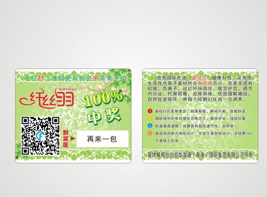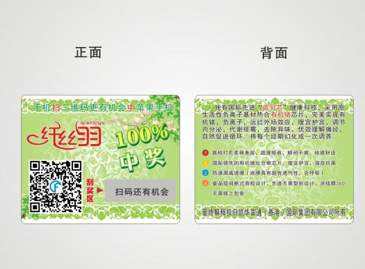 刮獎卡廣泛應用于各類優(yōu)惠有獎活動中,是拓寬產(chǎn)品銷路提高銷量的上佳方法。該類卡核心工藝在于可變數(shù)據(jù)的印刷和刮刮銀區(qū)域的處理,可變數(shù)據(jù)一般以阿拉伯數(shù)字、英文字母、中文漢字的形式制作;刮刮銀通常以絲印或者貼標的方式制作,兩種方式對數(shù)據(jù)的安全性都有良好的保證。