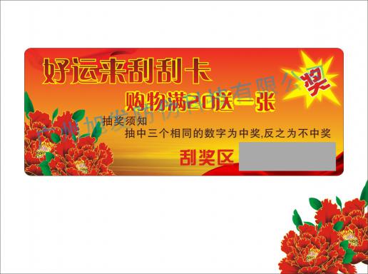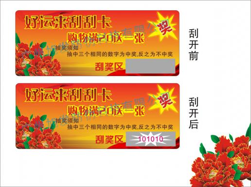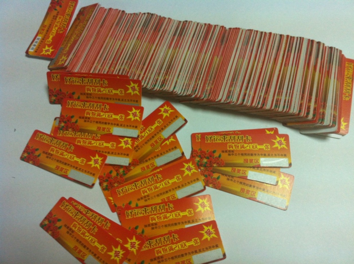 抽獎式刮刮卡包括刮獎卡、刮刮樂卡、促銷抽獎卡、抽獎積分卡此類刮刮卡應用比較廣泛,由其對大型超市及各類產(chǎn)品生產(chǎn)商是非常不錯的營銷方式。此類產(chǎn)品一般是用200-350g的雙銅紙印刷,并用涂層覆蓋刮獎區(qū)和驗證碼區(qū)。